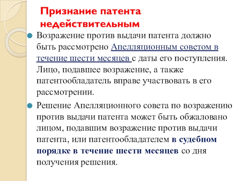 Решение Апелляционного совета по возражению против выдачи патента может быть обжаловано лицом, подавшим возражение против выдачи патента, или патентообладателем в судебном порядке в течение шести месяцев со дня получения решения.