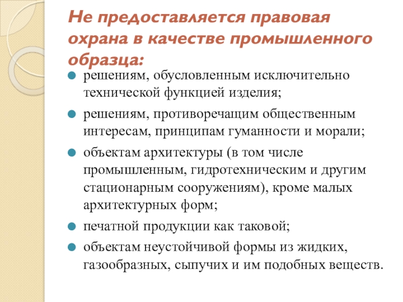 Слайд 11Не предоставляется правовая охрана в качестве промышленного образца: