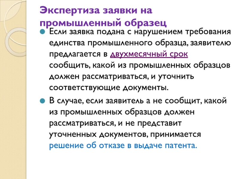 В случае, если заявитель а не сообщит, какой из промышленных образцов должен рассматриваться, и не представит уточненных документов, принимается решение об отказе в выдаче патента.
