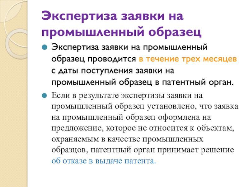 Если в результате экспертизы заявки на промышленный образец установлено, что заявка на промышленный образец оформлена на предложение, которое не относится к объектам, охраняемым в качестве промышленных образцов, патентный орган принимает решение об отказе в выдаче патента.