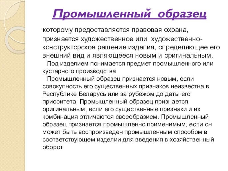 Промышленный образец признается новым, если совокупность его существенных признаков неизвестна в Республике Беларусь или за рубежом до даты его приоритета. Промышленный образец признается оригинальным, если его существенные признаки и их комбинация отличаются своеобразием. Промышленный образец признается промышленно применимым, если он может быть воспроизведен промышленным способом в соответствующем изделии для введения в хозяйственный оборот