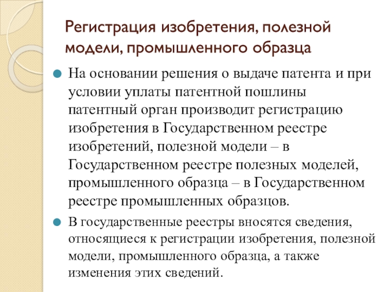 регистрацию изобретения в Государственном реестре изобретений, полезной модели – в Государственном реестре полезных моделей, промышленного образца – в Государственном реестре промышленных образцов.
