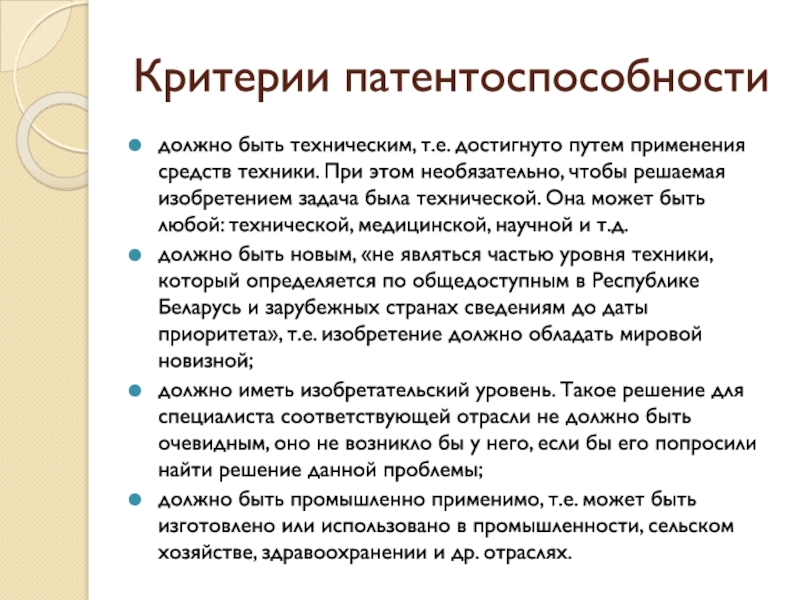 должно иметь изобретательский уровень. Такое решение для специалиста соответствующей отрасли не должно быть очевидным, оно не возникло бы у него, если бы его попросили найти решение данной проблемы;