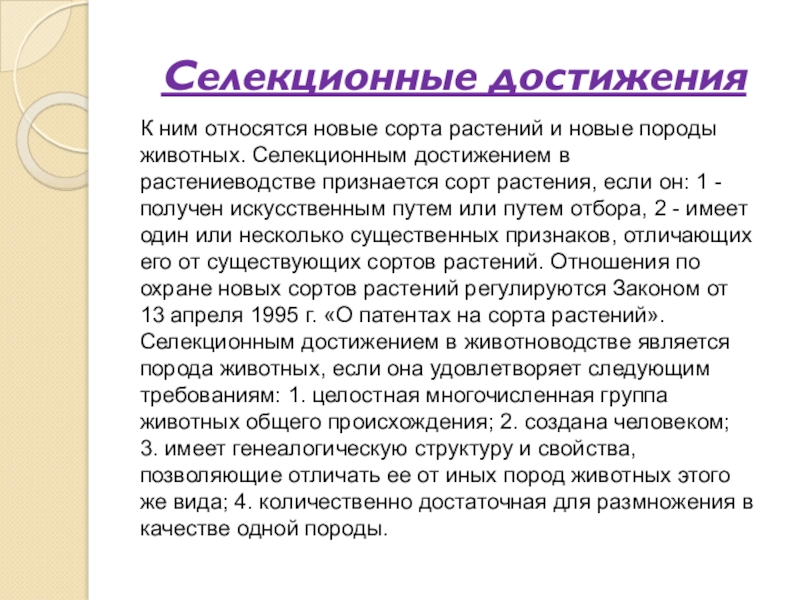 1 - получен искусственным путем или путем отбора, 2 - имеет один или несколько существенных признаков, отличающих его от существующих сортов растений. Отношения по охране новых сортов растений регулируются Законом от 13 апреля 1995 г. «О патентах на сорта растений». Селекционным достижением в животноводстве является порода животных, если она удовлетворяет следующим требованиям: 1. целостная многочисленная группа животных общего происхождения; 2. создана человеком; 3. имеет генеалогическую структуру и свойства, позволяющие отличать ее от иных пород животных этого же вида; 4. количественно достаточная для размножения в качестве одной породы.