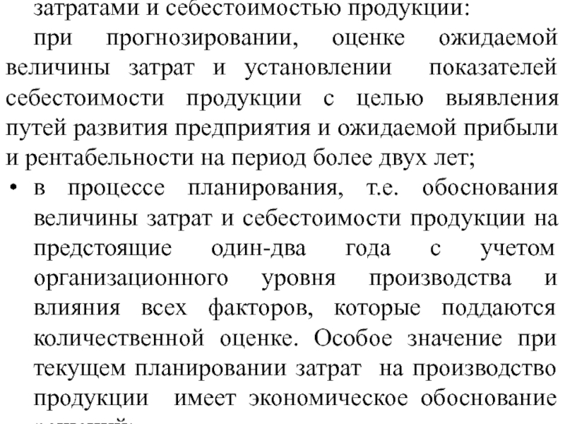 в процессе планирования, т.е. обоснования величины затрат и себестоимости продукции на предстоящие один-два года с учетом организационного уровня производства и влияния всех факторов, которые поддаются количественной оценке. Особое значение при текущем планировании затрат на производство продукции имеет экономическое обоснование решений: