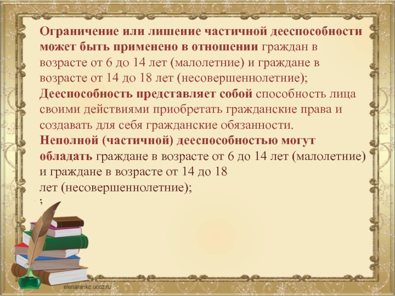 Неполной (частичной) дееспособностью могут обладать граждане в возрасте от 6 до 14 лет (малолетние) и граждане в возрасте от 14 до 18 лет (несовершеннолетние);