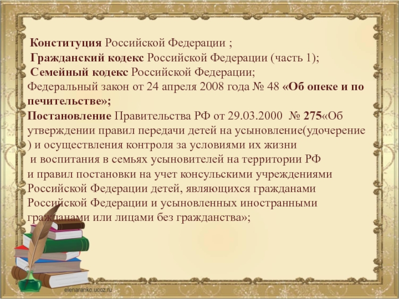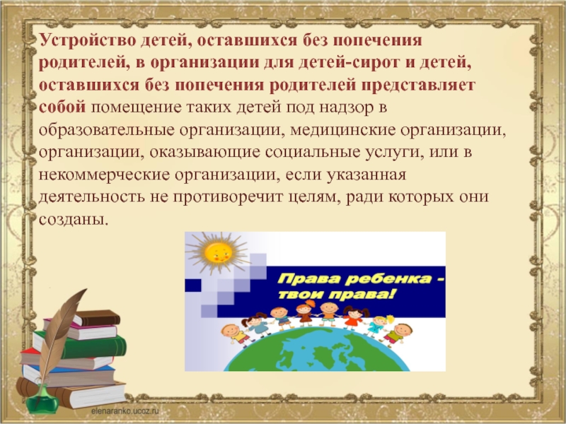 Слайд 1Основы законодательства Российской Федерации об устройстве детей, оставшихся без попечения