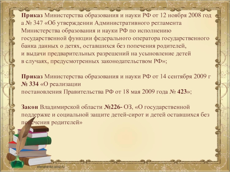Слайд 4Приказ Министерства образования и науки РФ от 12 ноября 2008 года № 347 «Об утверждении Административного регламента