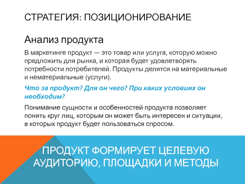 ПРОДУКТ ФОРМИРУЕТ ЦЕЛЕВУЮ АУДИТОРИЮ, ПЛОЩАДКИ И МЕТОДЫ