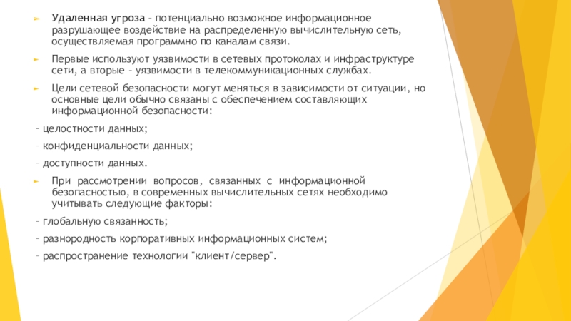 Слайд 3Удаленная угроза – потенциально возможное информационное разрушающее воздействие на распределенную