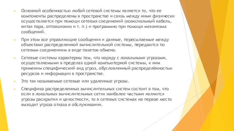 Сетевые системы характерны тем, что наряду с локальными угрозами, осуществляемыми в пределах одной компьютерной системы, к ним применим специфический вид угроз, обусловленный распределённостью ресурсов и информации в пространстве.