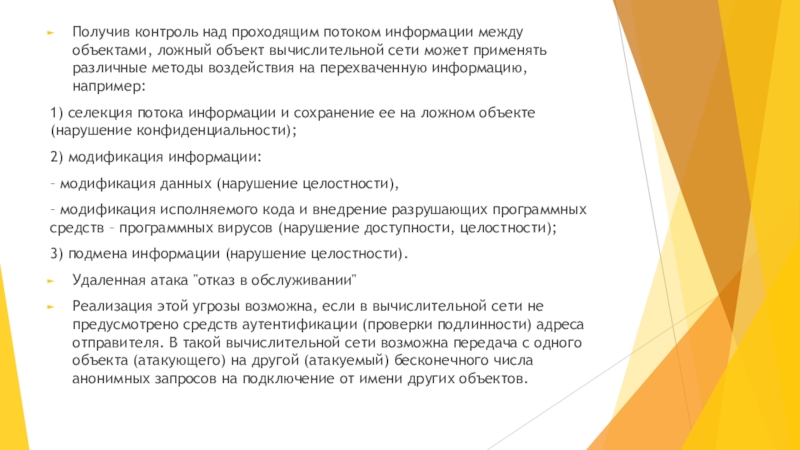 1) селекция потока информации и сохранение ее на ложном объекте (нарушение конфиденциальности);