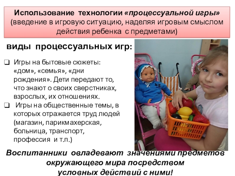 Воспитанники овладевают значениями предметов окружающего мира посредством условных действий с ними!