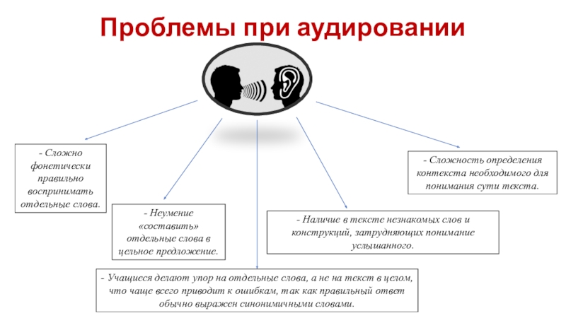- Наличие в тексте незнакомых слов и конструкций, затрудняющих понимание услышанного.