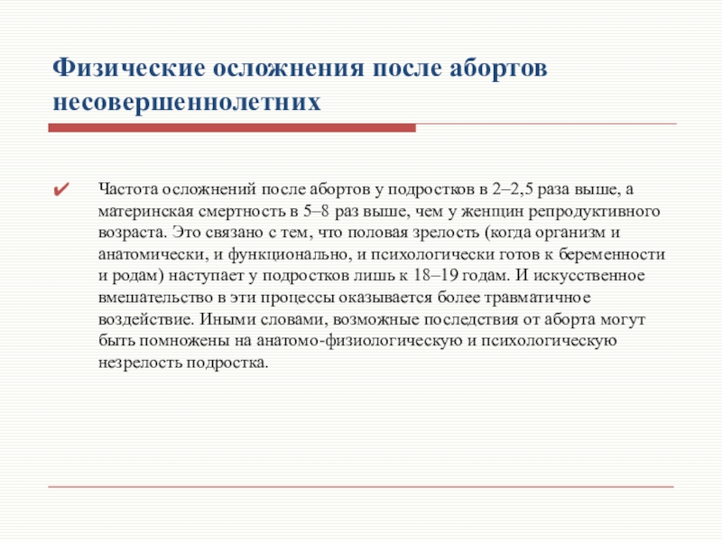 выше, чем у женщин репродуктивного возраста. Это связано с тем, что половая зрелость (когда организм и анатомически, и функционально, и психологически готов к беременности и родам) наступает у подростков лишь к 18–19 годам. И искусственное вмешательство в эти процессы оказывается более травматичное воздействие. Иными словами, возможные последствия от аборта могут быть помножены на анатомо-физиологическую и психологическую незрелость подростка.