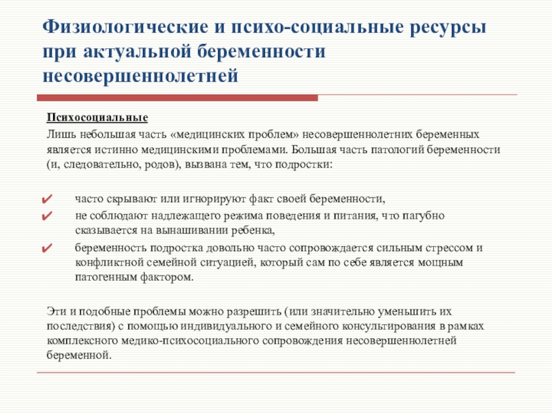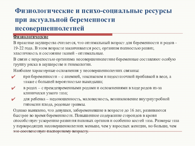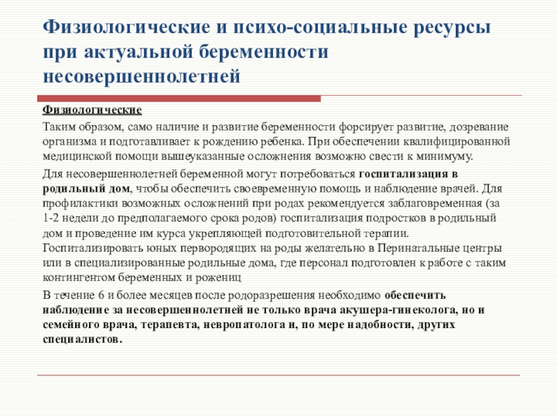 Слайд 18Физиологические и психо-социальные ресурсы при актуальной беременности несовершеннолетней