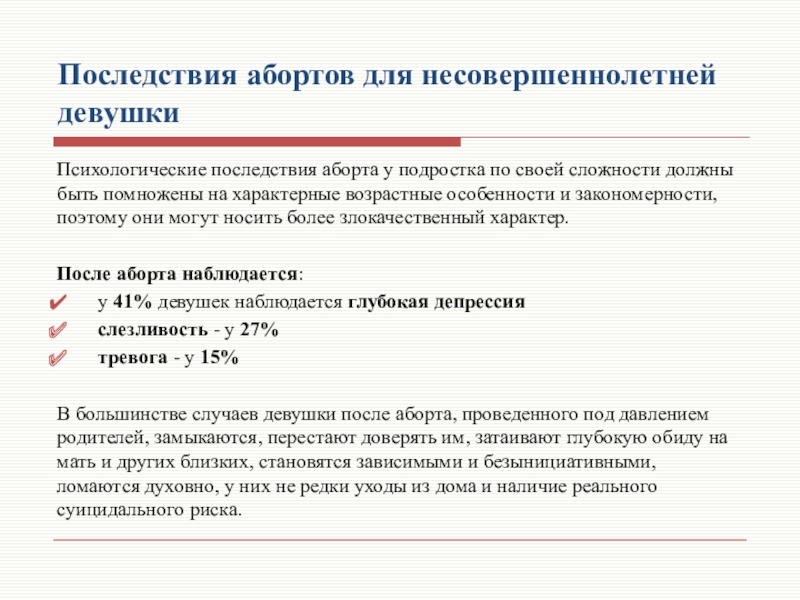 Слайд 13Последствия абортов для несовершеннолетней девушки