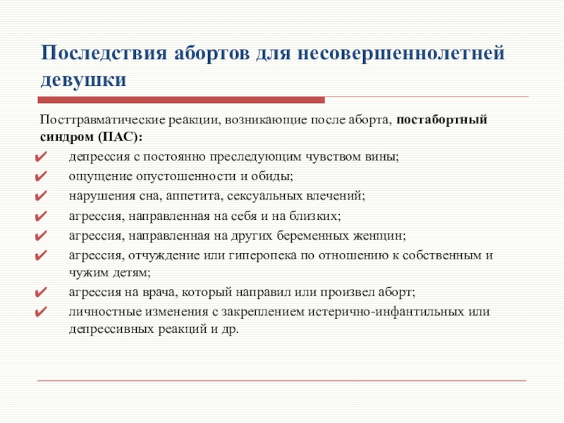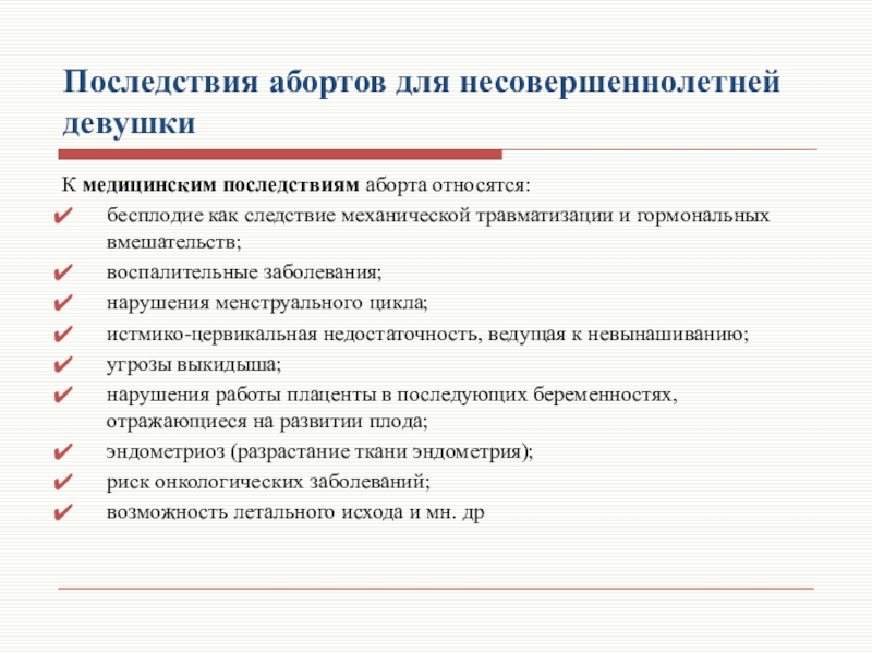 Слайд 8Последствия абортов для несовершеннолетней девушки