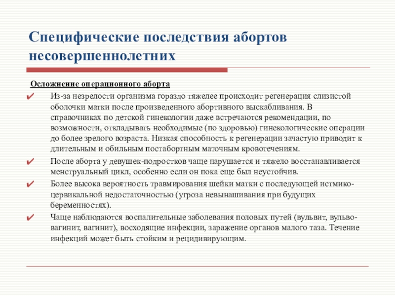 Слайд 12Специфические последствия абортов несовершеннолетних