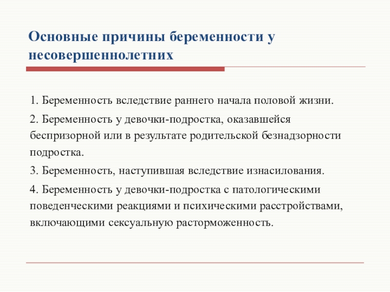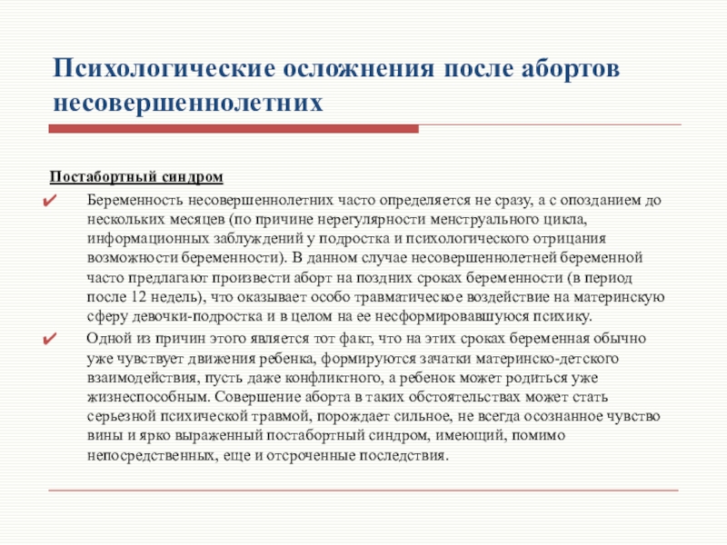 нерегулярности менструального цикла, информационных заблуждений у подростка и психологического отрицания возможности беременности). В данном случае несовершеннолетней беременной часто предлагают произвести аборт на поздних сроках беременности (в период после 12 недель), что оказывает особо травматическое воздействие на материнскую сферу девочки-подростка и в целом на ее несформировавшуюся психику.