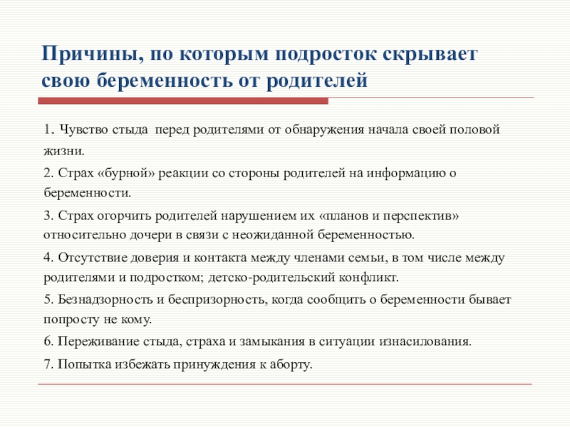 Слайд 7Причины, по которым подросток скрывает свою беременность от родителей