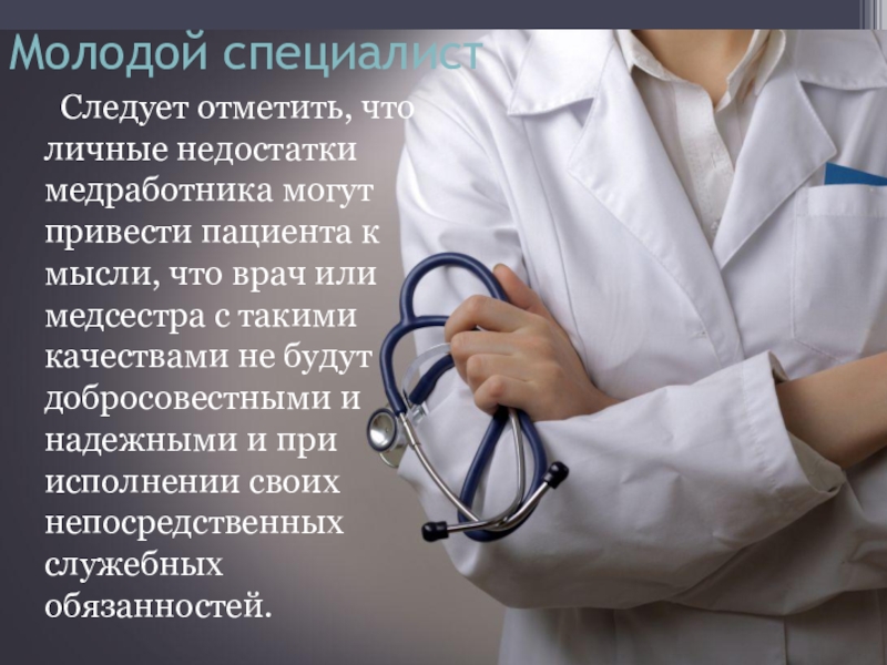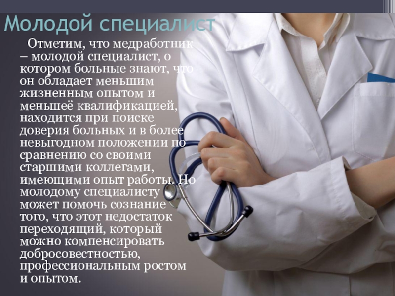 и меньшеё квалификацией, находится при поиске доверия больных и в более невыгодном положении по сравнению со своими старшими коллегами, имеющими опыт работы. Но молодому специалисту может помочь сознание того, что этот недостаток переходящий, который можно компенсировать добросовестностью, профессиональным ростом и опытом.