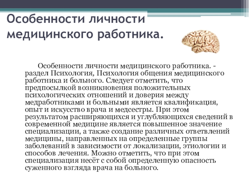 и больного. Следует отметить, что предпосылкой возникновения положительных психологических отношений и доверия между медработниками и больными является квалификация, опыт и искусство врача и медсестры. При этом результатом расширяющихся и углубляющихся сведений в современной медицине является повышенное значение специализации, а также создание различных ответвлений медицины, направленных на определенные группы заболеваний в зависимости от локализации, этиологии и способов лечения. Можно отметить, что при этом специализация несёт с собой определенную опасность суженного взгляда врача на больного.