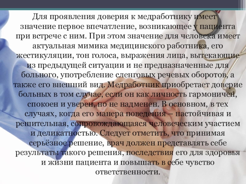 ним. При этом значение для человека имеет актуальная мимика медицинского работника, его жестикуляции, тон голоса, выражения лица, вытекающие из предыдущей ситуации и не предназначенные для больного, употребление сленговых речевых оборотов, а также его внешний вид. Медработник приобретает доверие больных в том случае, если он как личность гармоничен, спокоен и уверен, но не надменен. В основном, в тех случаях, когда его манера поведения – настойчивая и решительная, сопровождающаяся человеческим участием и деликатностью. Следует отметить, что принимая серьёзное решение, врач должен представлять себе результаты такого решения, последствия его для здоровья и жизни пациента и повышать в себе чувство ответственности.