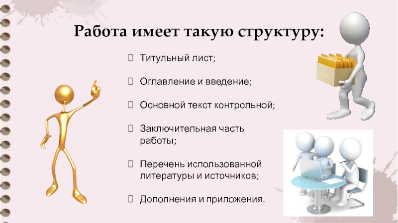 Работа имеет такую структуру:Титульный лист;Оглавление и введение;Основной текст контрольной;Заключительная часть работы;Перечень использованной литературы и источников;Дополнения и приложения.