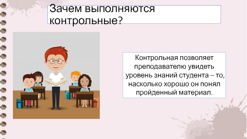 Зачем выполняются контрольные?Контрольная позволяет преподавателю увидеть уровень знаний студента – то, насколько хорошо он понял пройденный материал.