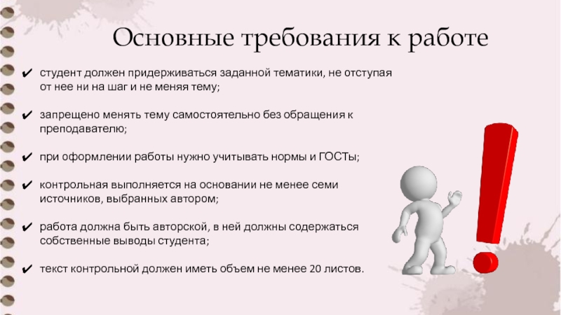 Основные требования к работестудент должен придерживаться заданной тематики, не отступая от нее ни на шаг и не