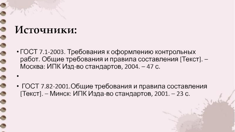 Источники:ГОСТ 7.1-2003. Требования к оформлению контрольных работ. Общие требования и правила составления [Текст]. – Москва: ИПК Изд-во