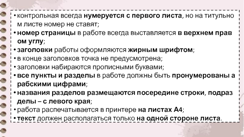 Слайд 8контрольная всегда нумеруется с первого листа, но на титульном листе номер не ставят;
