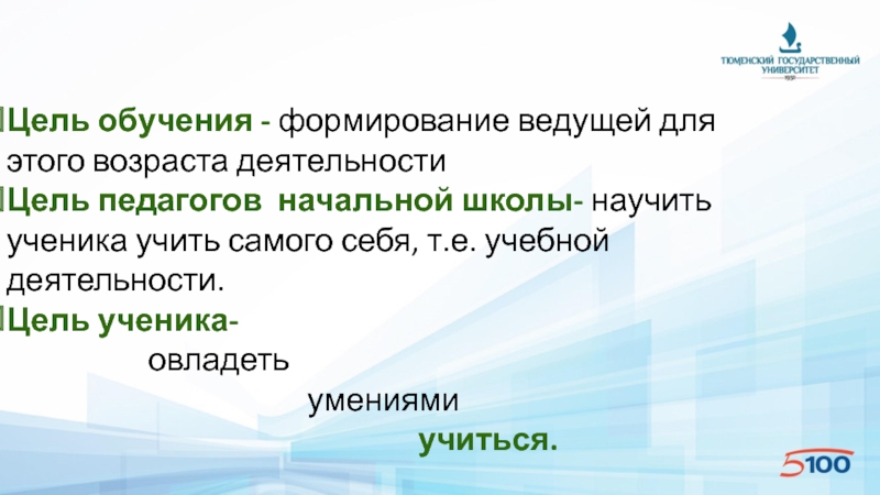 начальной школы- научить ученика учить самого себя, т.е. учебной деятельности.