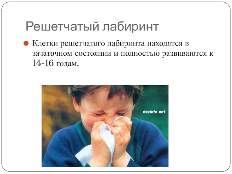 Решетчатый лабиринтКлетки решетчатого лабиринта находятся в зачаточном состоянии и полностью развиваются к 14-16 годам.