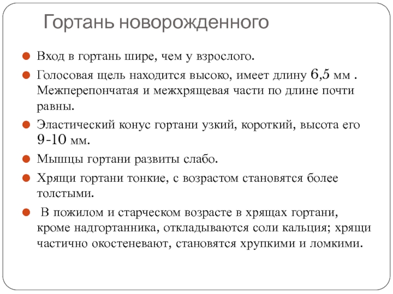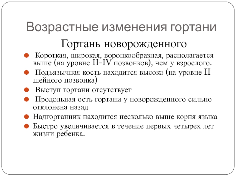 Возрастные изменения гортаниГортань новорожденного Короткая, широкая, воронкообразная, располагается выше (на уровне II-IV позвонков), чем у взрослого. Подъязычная