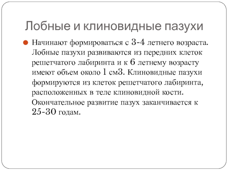 6 летнему возрасту имеют объем около 1 см3. Клиновидные пазухи формируются из клеток решетчатого лабиринта, расположенных в теле клиновидной кости. Окончательное развитие пазух заканчивается к 25-30 годам.