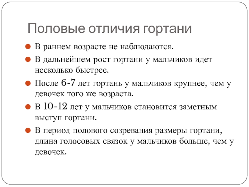 Половые отличия гортани В раннем возрасте не наблюдаются. В дальнейшем рост гортани у мальчиков идет несколько быстрее.После