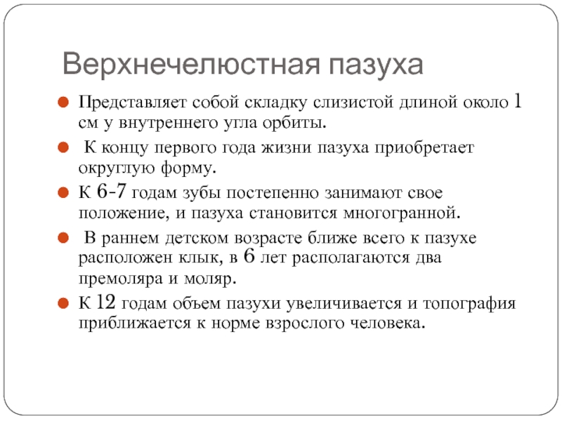Верхнечелюстная пазухаПредставляет собой складку слизистой длиной около 1 см у внутреннего угла орбиты. К концу первого года