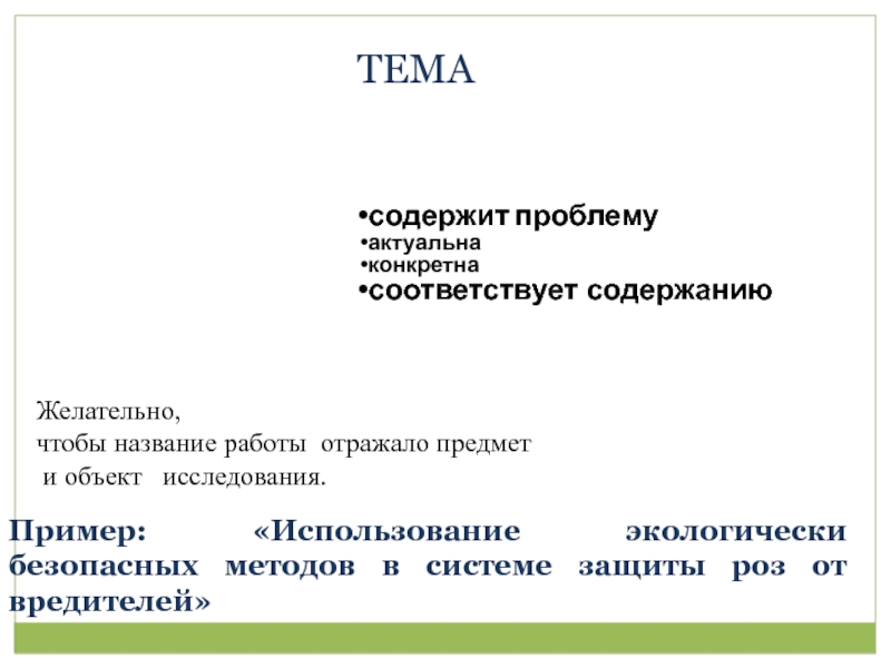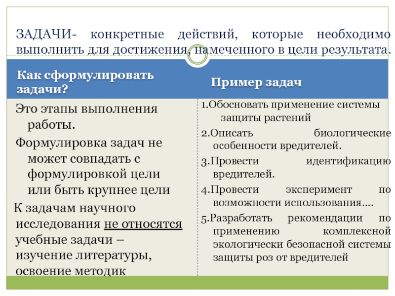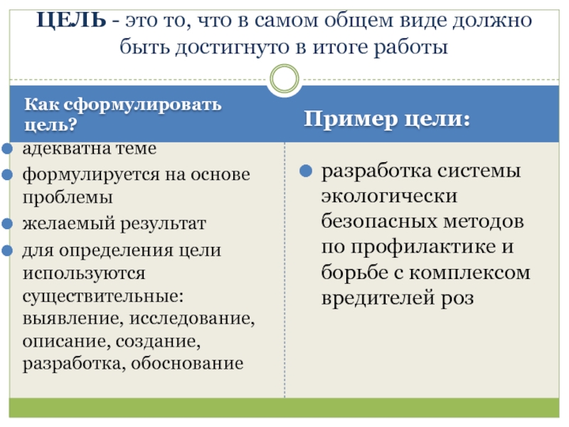 Цель проекта и/или исследования повторяет тему (иногда неграмотно сформулированную проблему), не содержит образа предполагаемого результата.