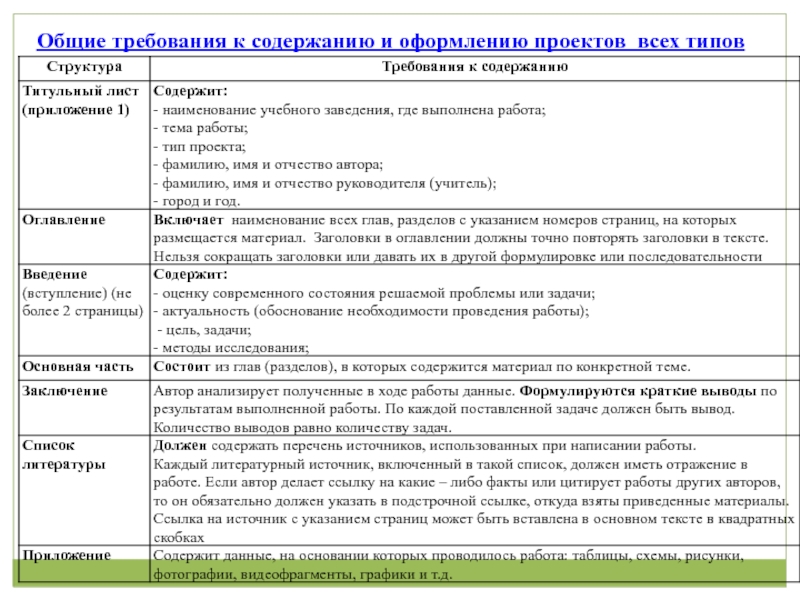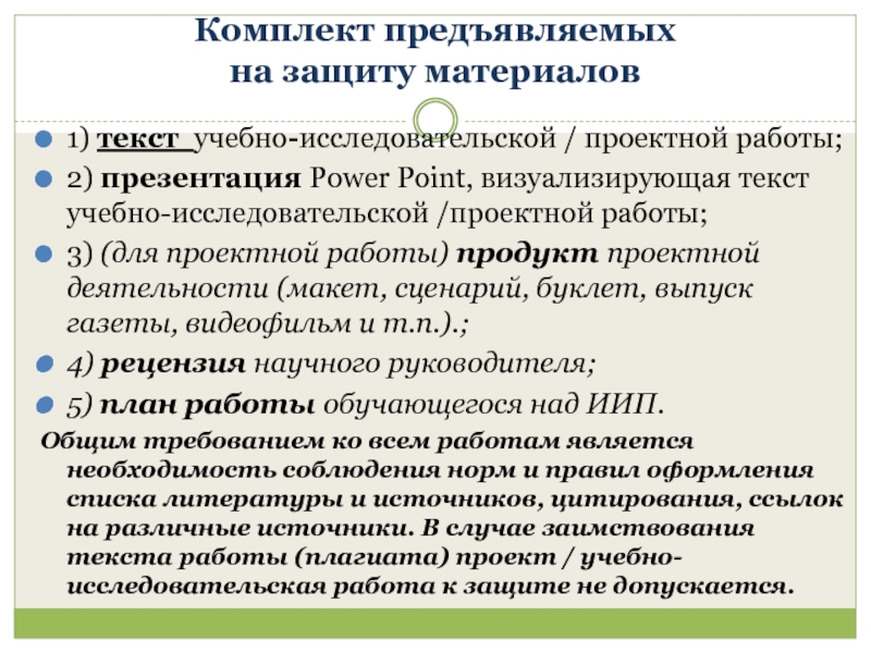 Общим требованием ко всем работам является необходимость соблюдения норм и правил оформления списка литературы и источников, цитирования, ссылок на различные источники. В случае заимствования текста работы (плагиата) проект / учебно- исследовательская работа к защите не допускается.
