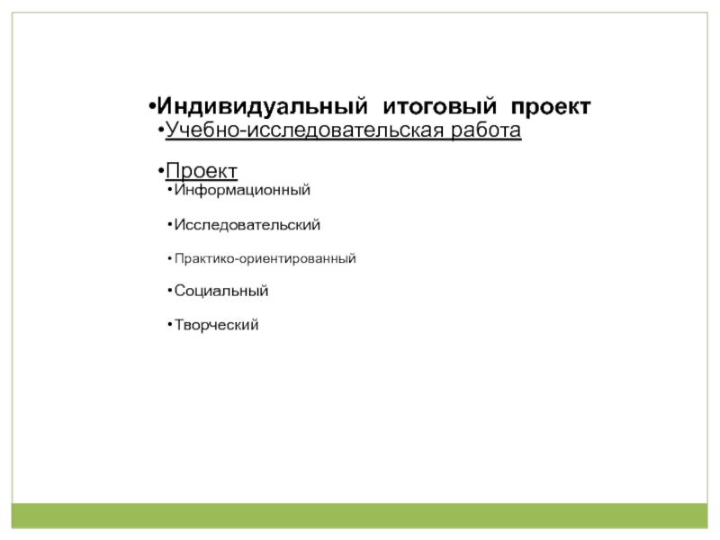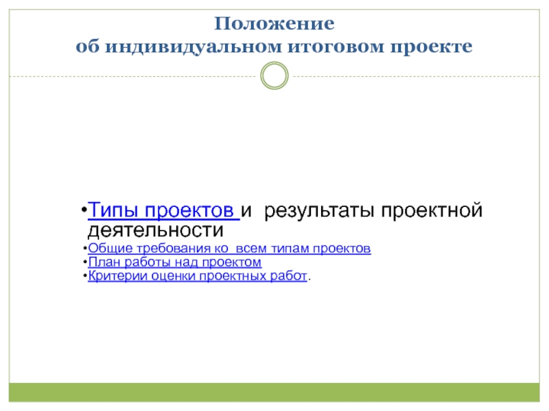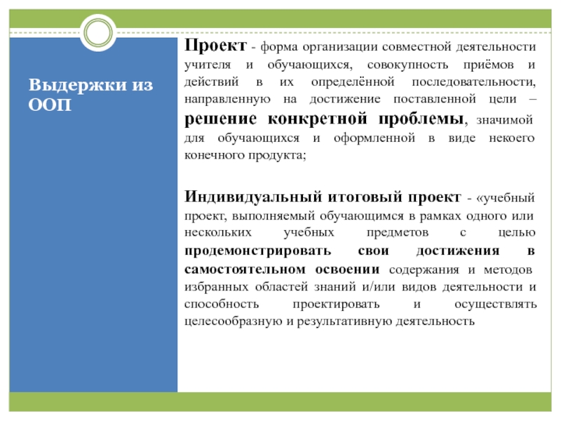 Индивидуальный итоговый проект - «учебный проект, выполняемый обучающимся в рамках одного или нескольких учебных предметов с целью продемонстрировать свои достижения в самостоятельном освоении содержания и методов избранных областей знаний и/или видов деятельности и способность проектировать и осуществлять целесообразную и результативную деятельность