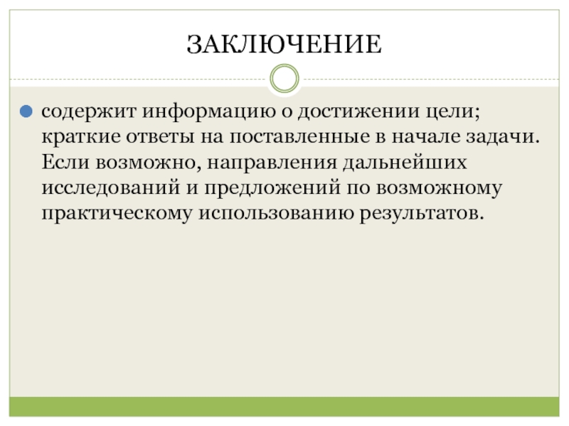 содержит информацию о достижении цели; краткие ответы на поставленные в