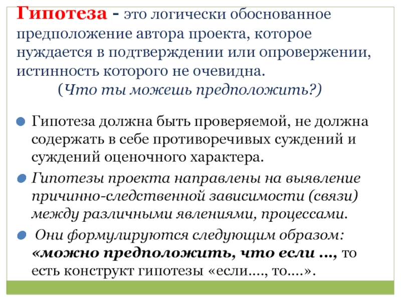 Гипотеза должна быть проверяемой, не должна содержать в себе противоречивых суждений и суждений оценочного характера.