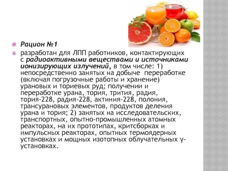 Слайд 1Особенности питания работников контактирующих с радиоактивными веществами и источниками ионизирующих