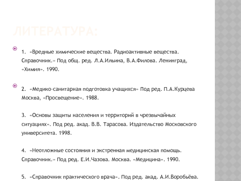 1. «Вредные химические вещества. Радиоактивные вещества. Справочник.» Под общ. ред. Л.А.Ильина,