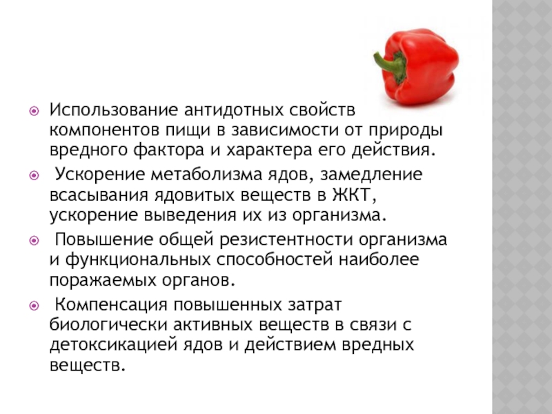Слайд 4Использование антидотных свойств компонентов пищи в зависимости от природы вредного