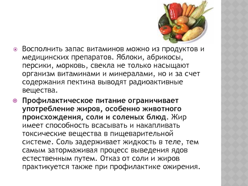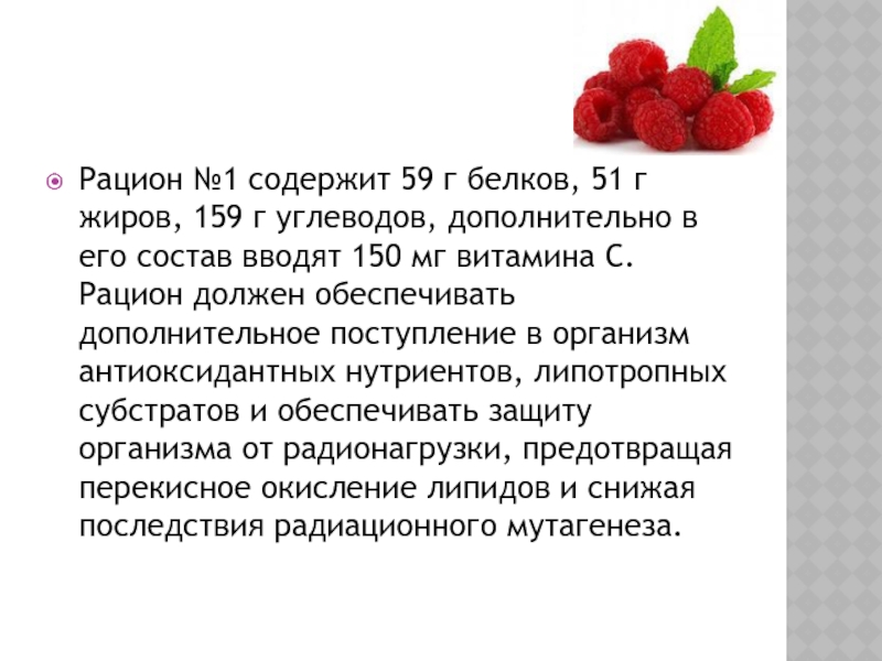 С. Рацион должен обеспечивать дополнительное поступление в организм антиоксидантных нутриентов, липотропных субстратов и обеспечивать защиту организма от радионагрузки, предотвращая перекисное окисление липидов и снижая последствия радиационного мутагенеза.