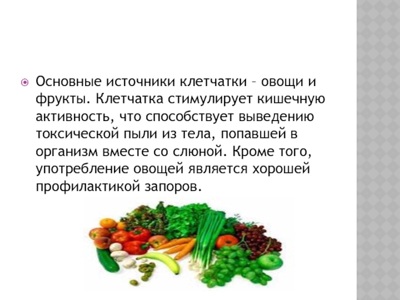 Слайд 11Основные источники клетчатки – овощи и фрукты. Клетчатка стимулирует кишечную