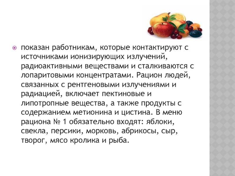 излучениями и радиацией, включает пектиновые и липотропные вещества, а также продукты с содержанием метионина и цистина. В меню рациона № 1 обязательно входят: яблоки, свекла, персики, морковь, абрикосы, сыр, творог, мясо кролика и рыба.
